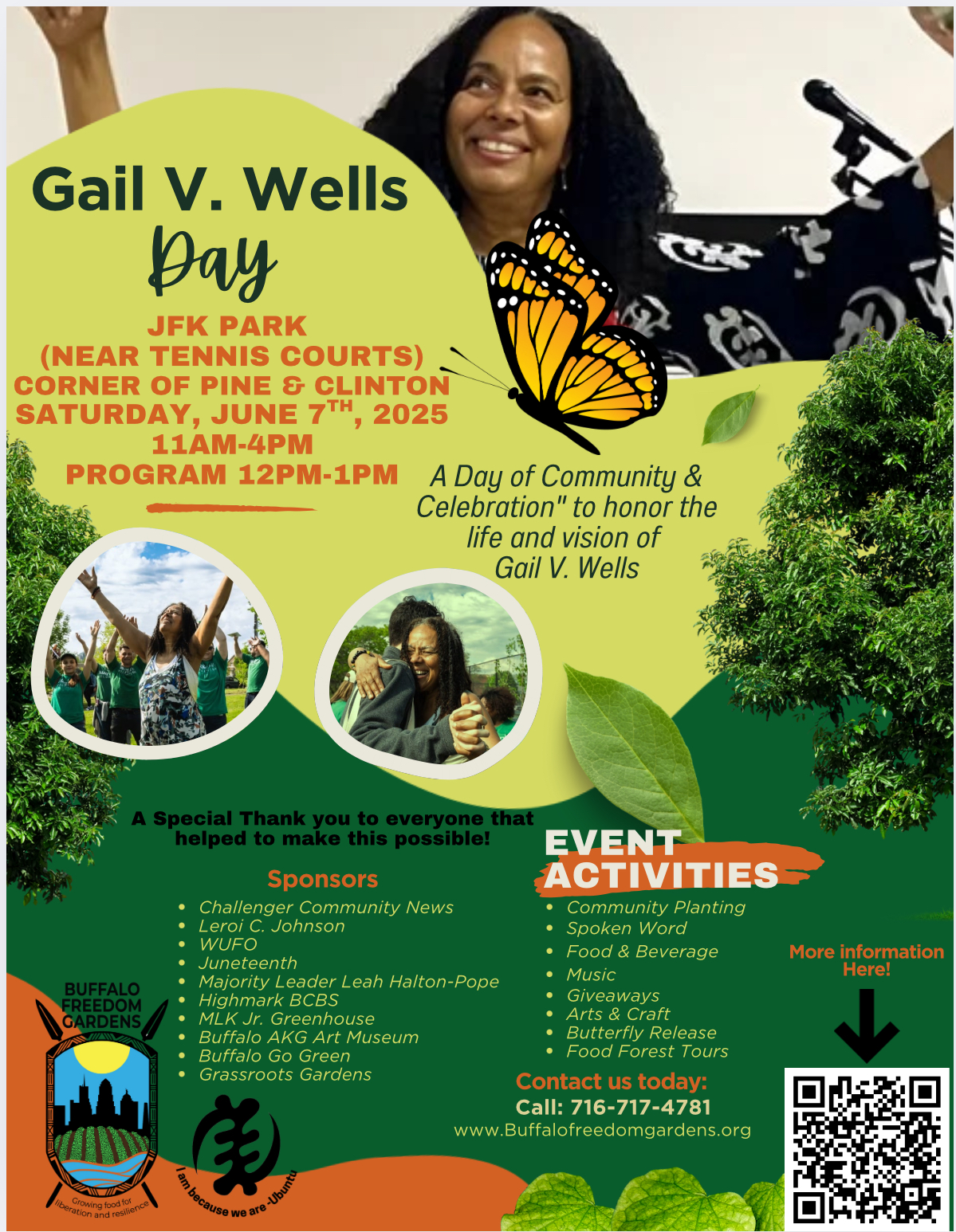 On June 7th, we invite you to join us in celebrating the life and vision of Gail V. Wells, founder of Buffalo Freedom Gardens! This event will bring together gardeners, activists, and families to honor Gail’s work in food justice, education, and empowerment through hands-on activities, flower planting, urban farming workshops, arts & crafts, live performances, and shared stories of resilience and collective growth.